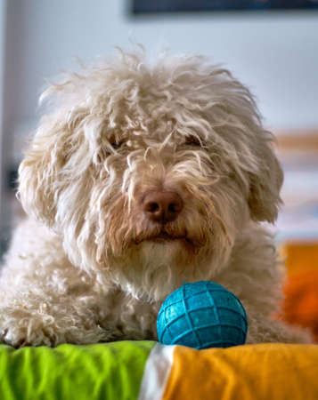 A shallow focus of a white Spanish water dog with his ball