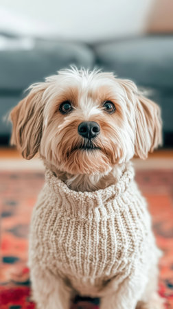Adorable small dog wearing a cozy knit sweater in a warm home setting.