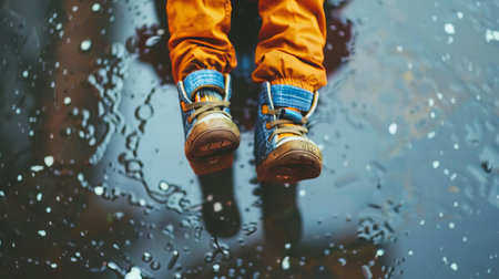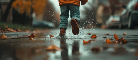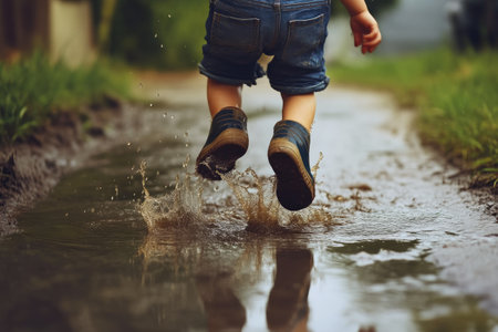 A joyful child jumps in a puddle, creating splashes with their colorful rain boots. The scene captures the essence of childhood fun on a rainy day.