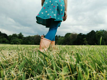 Closeup of girl legs feet in rain boots walking on meadow. Freedom, innocence and adolescense concept. Summer fun outdoor activity for children. Low angle view.