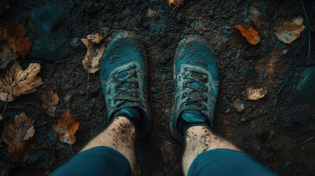 Close-up of muddy hiking shoes on a forest floor, surrounded by fallen leaves. This image captures the spirit of outdoor adventure and exploration.
