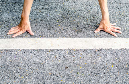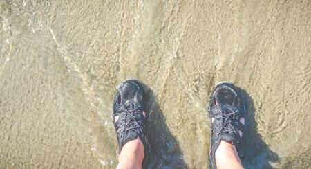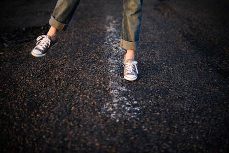 sneakers on ground, woman taking a walk on the summer road in sunny evening. top view at legs and shoes on ground asphalt. travel and vacation. exercise outdoors