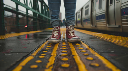 Close-Up of Person Feet on Yellow Safety Line as Train Arrives ai generated