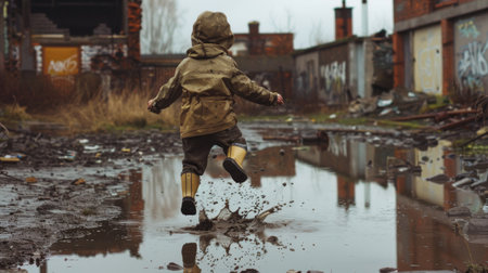Child in a raincoat joyfully jumping into a puddle in a desolate industrial area with murky reflections.