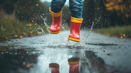 A joyful child jumps in a shallow puddle wearing vibrant red rubber boots, splashing water in a stunning autumn outdoor setting, emphasizing carefree fun.