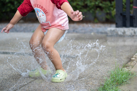 Cropped image of child jumping in puddles. Toddler jumping in pool of water at the summer or autumn day.