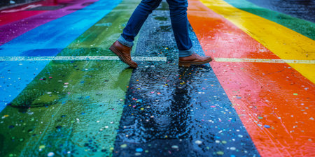 Vibrant Rainbow-Colored Crosswalk on a Rainy Day.