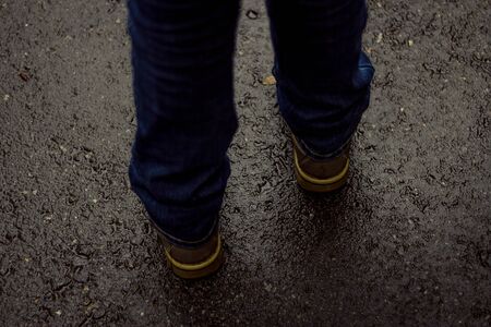 Back view of man in boots and jeans on a rainny day on a wet asphalt