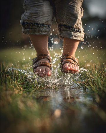 Child's feet are splashing in water puddle on grass, wearing brown sandals, creating a joyful scene of playfulness and connection with nature's elements