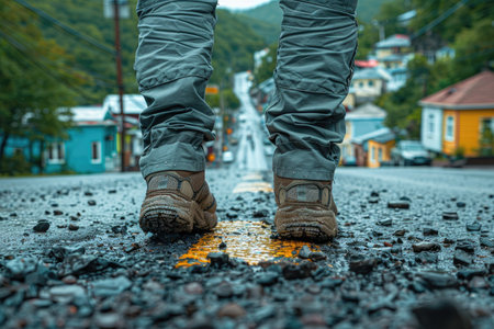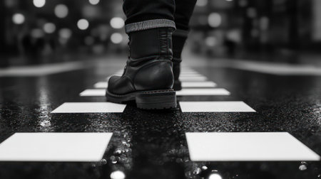 person, walking on wet asphalt, with shoes and footprints visible, created with generative ai