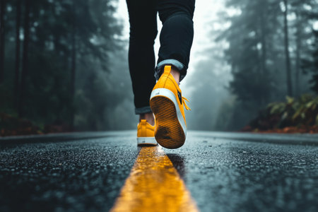A person wearing vibrant yellow sneakers walks on a rain-soaked road, surrounded by foggy trees. The atmosphere is serene, reflecting an early morning vibe in nature.