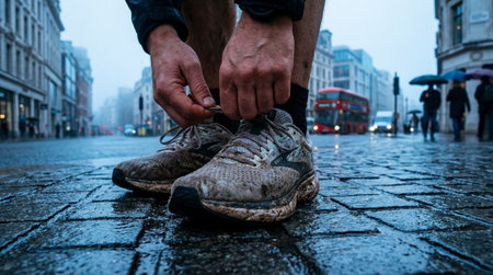 Close-up view captures hands tying muddy sneakers on wet cobblestones. A red double-decker bus blurs in the rainy urban background. Puddles reflect the overcast sky.