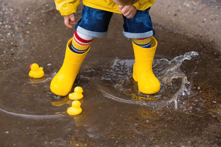 Mischievous preschooler child wearing yellow rubber rain boots jumping in large wet mud puddle. Kid playing and having fun. Outdoors games for children.