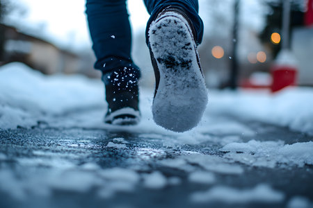 Close up of a person's feet on an icy street in a winter cityscape photograph
