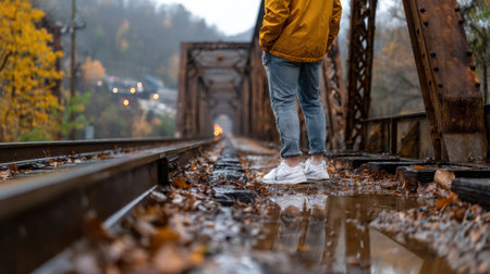 A person is standing on a train track in the rain. The train tracks are wet and muddy, and the person is wearing a yellow jacket. The scene is moody and somewhat ominous