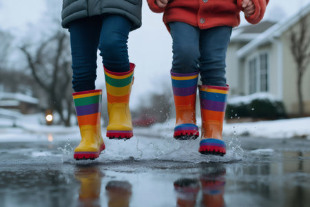 Two children wearing colorful rain boots are jumping in a puddle in a snowy residential area
