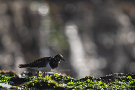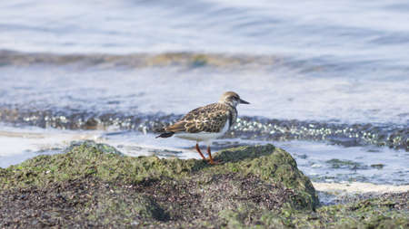 Ruddy turnstone standing on algae coated rock slab at the beach of Praia do Forte, Brazil