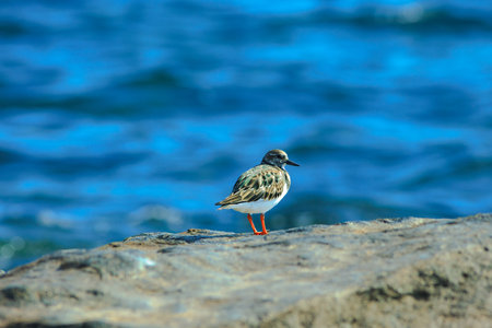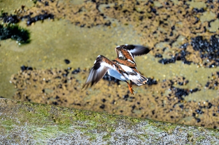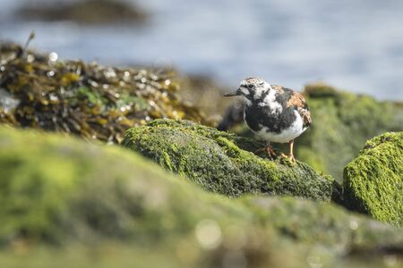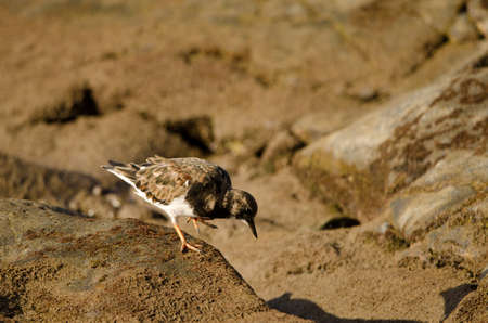 Ruddy turnstone wading bird, Arenaria interpres, foraging in between the rocks at the shore. These birds live in flocks at shore and are migratory.