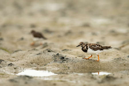 A close-up photo of a ruddy turnstone (Arenaria interpres) lonely and a pair taken in the soft morning light on the banks of a salty estuary.