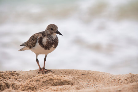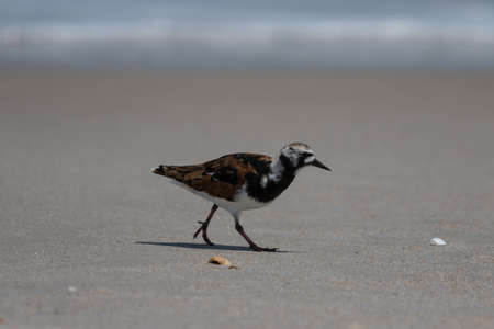 Small ruddy turnstone bird standing on the sand of a beach in dominican republic with blurred ocean in the background