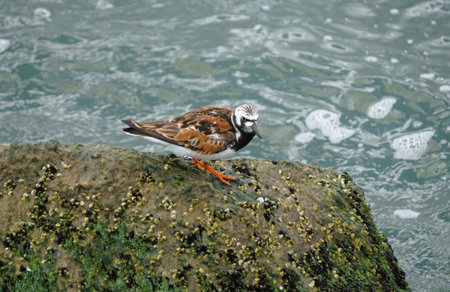 A Ruddy Turnstone perched on a seaweed-covered rock by the ocean