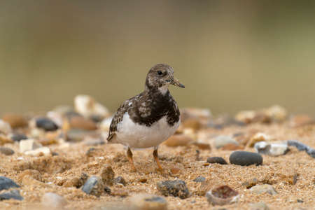 Ruddy turnstone (Arenaria interpres) shore bird feeding on coast. Wildlife scene in nature of Europe. Netherlands.