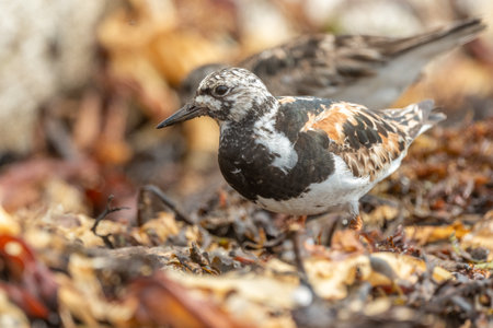 Ruddy Turnstone, Arenaria interpres, searching for food in seaweed at sea shoreline, close-up portrait, selective focus, shallow DOF