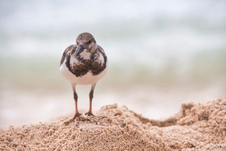 Small ruddy turnstone standing gracefully on a sand dune at a beach in the dominican republic, surrounded by the ocean's beauty