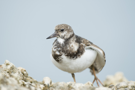 A Ruddy Turnstone stretches it wing and leg while standing on a light rock jetty in soft overcast light with a smooth background.