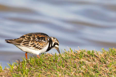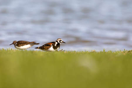 Single birds and small flocks of ruddy turnstone (Arenaria interpres) in breeding plumage are photographed on the lake in a natural habitat.