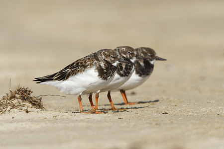 Ruddy turnstone (Arenaria interpres) three in a row on beach, Bolivar Peninsula, Texas, USA