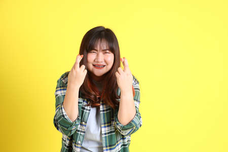 The chubby Asian woman standing on the yellow background with the casual clothes.