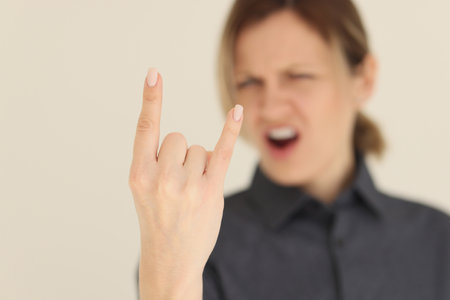 Blurry screaming woman shows horns gesture with fingers