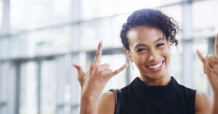 Business is booming. Cropped shot of a young businesswoman showing a rock n roll sign while walking through a modern office.