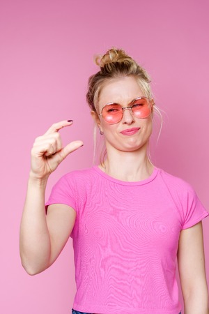 Image of surprised blonde in pink t-shirt holding hands on blank pink background.