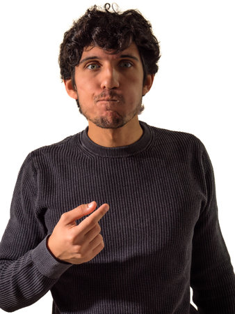 A man with a displeased face shows his middle finger.