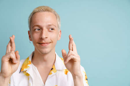 Young blonde man posing with fingers crossed for good luck isolated over blue background