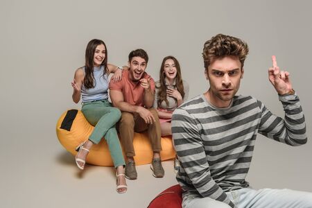 angry man showing middle finger to friends sitting on bin bag chair together, on grey