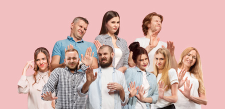 Collage about reject, rejection, doubt concept. Doubtful women and men with thoughtful expression making choice. Young emotional group of people. Human emotions, facial expression concept.