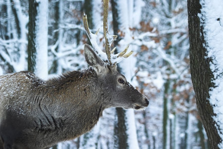Majestic red deer stag in snowy landscape, Czech Republic.