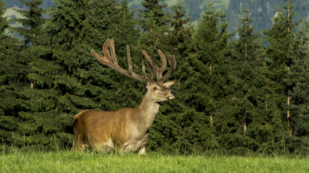 Majestic powerful adult male red deer stag on meadow. Animals in natural environment, beauty in nature.