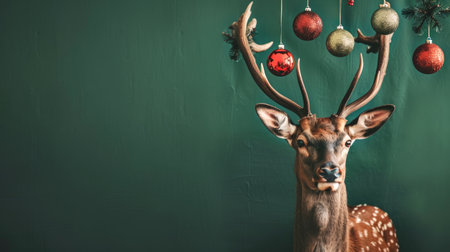 Festive reindeer with Christmas ornaments on antlers against dark green background. Concept of holiday decoration, winter animals, Christmas season, festive wildlife.