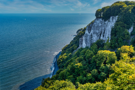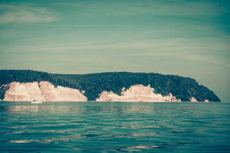Sassnitz. The famous chalk cliffs shoreline of Jasmund National Park ruegen island germany, view from yacht boat