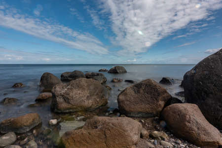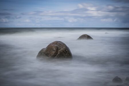 Beautiful long exposure landscape of rocky sea shore. Tranquil scene of Baltic sea near Gdynia in Poland.