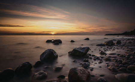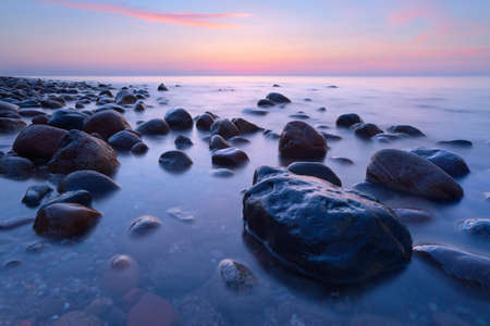 Beautifu rocky sea shore at sunrise or sunset. Long exposure landscape. Baltic sea near Gdynia in Poland.