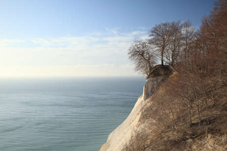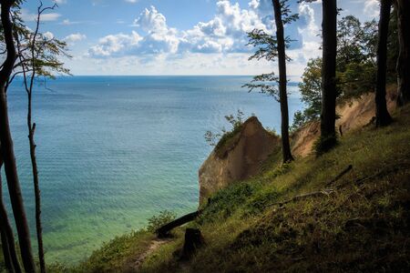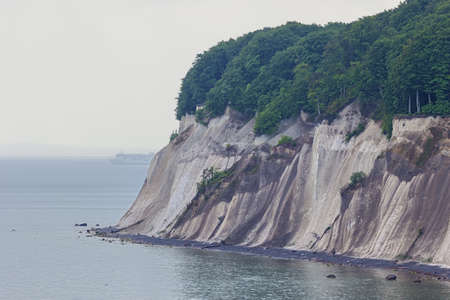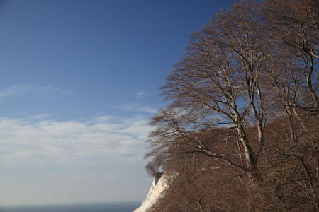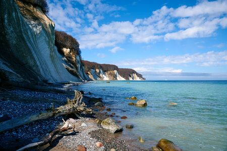 SASSNITZ, GERMANY - APRIL 3, 2015: High chalk cliffs at the coast of Rugen island, Jasmund National Park, Mecklenburg-Vorpommern, Germany