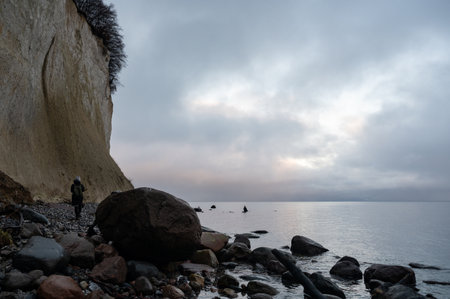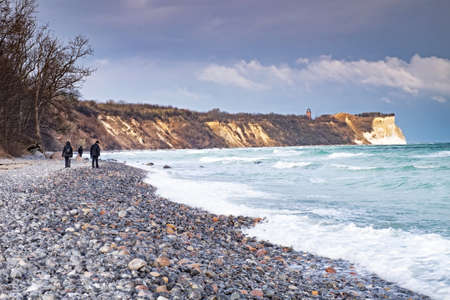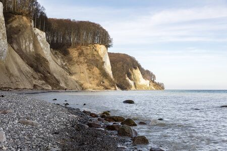 Pebbly beach on the chalk coast of Ruegen, Germany, in winter