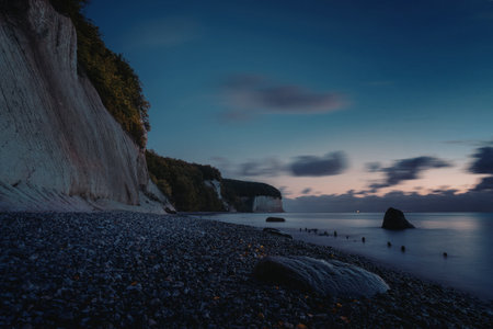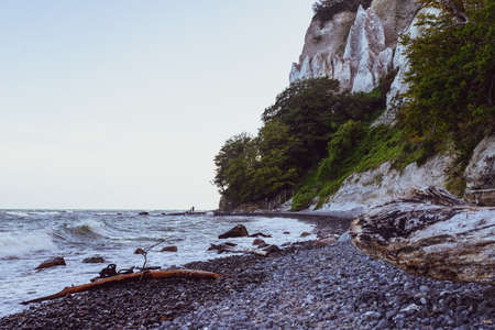 Boulders at flintstone pebbles beach on Ruegen island. Typical white chalk cliff of shore. Mecklenburg west Pomerania, Germany