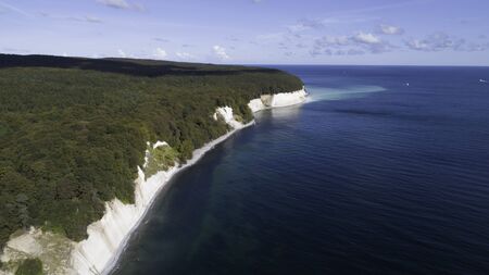 Aerial view of white cliffs, dense forest and buildings in classic Scandinavian architectural style perched near the edge against the backdrop of a calm blue sea. Landscape of chalk