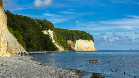 Chalk cliffs on the Baltic Sea on the island of Rügen, Mecklenburg-Western Pomerania, Germany, Europe. With people walking along the beach